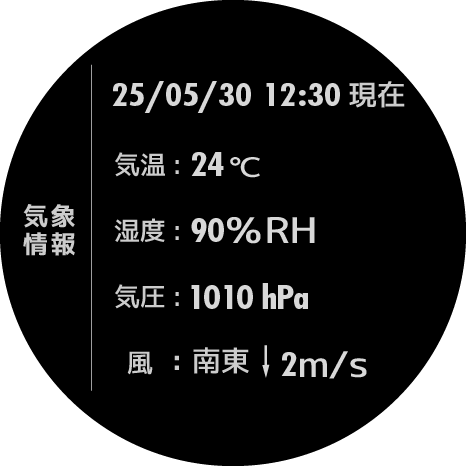 プレイメニューで「気象情報」をタップするか+(プラス)/-(マイナス)キーでカーソルを合わせて OKキーを押すとスマートフォンアプリ「GREENON」より受信した気象情報を一覧で表示します。