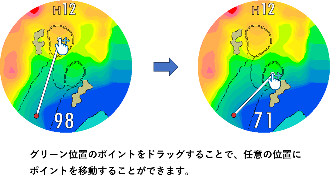 ホール番号と現在位置からグリーン位置までの距離を表示します。 グリーン位置のポイントはドラッグすることにより任意の位置に移動することが可能です。