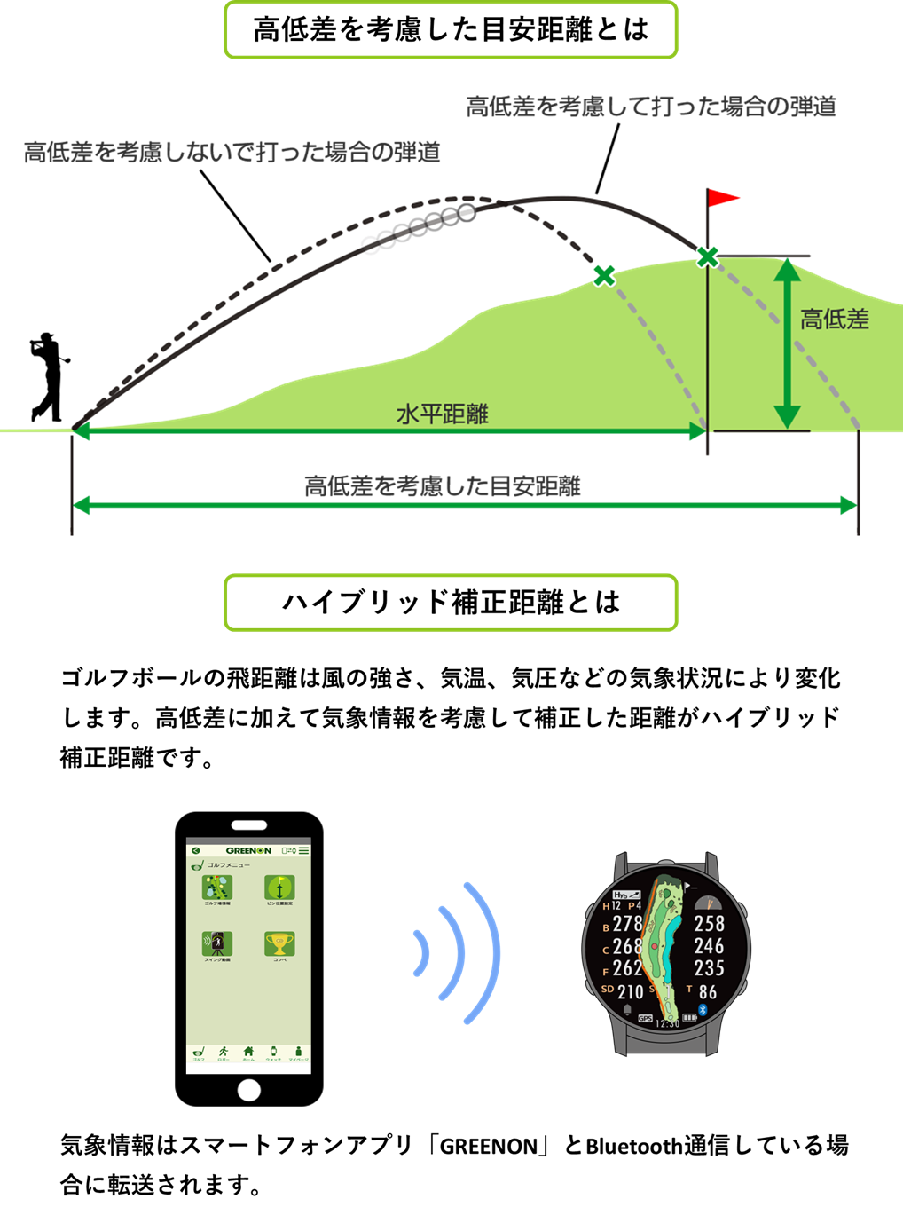クラブの選択肢、各クラブの飛距離はスマートフォンアプリ「GREENON」を使って変更することができます。