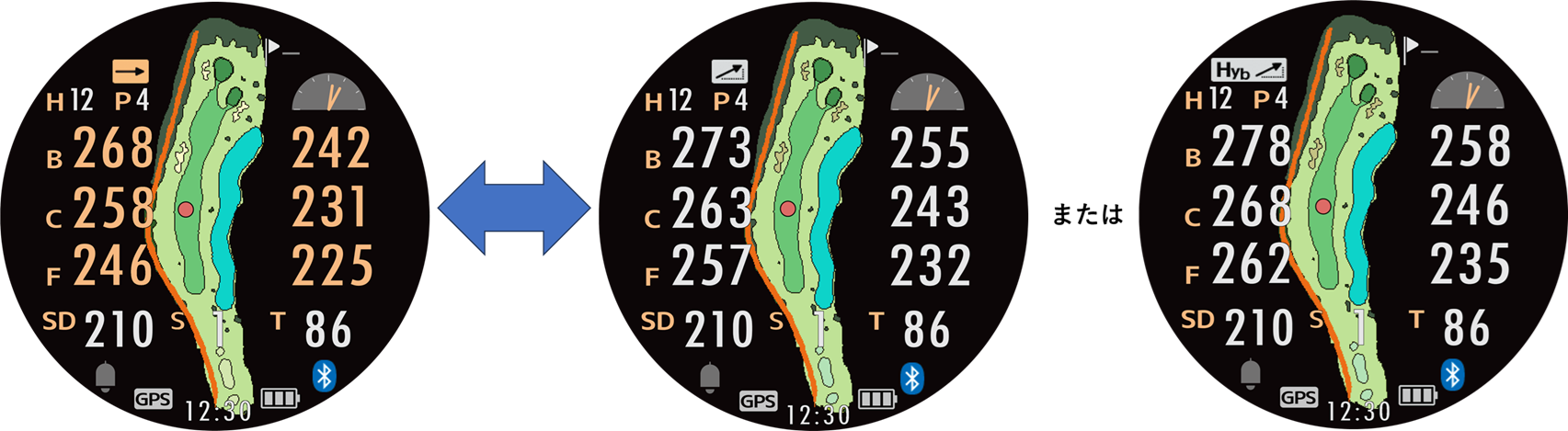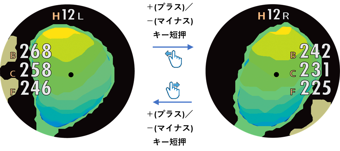 2グリーンホールの場合は左右スワイプするか+(プラス)/-(マイナス)キーを押すと左右グリーンが切り替わります。