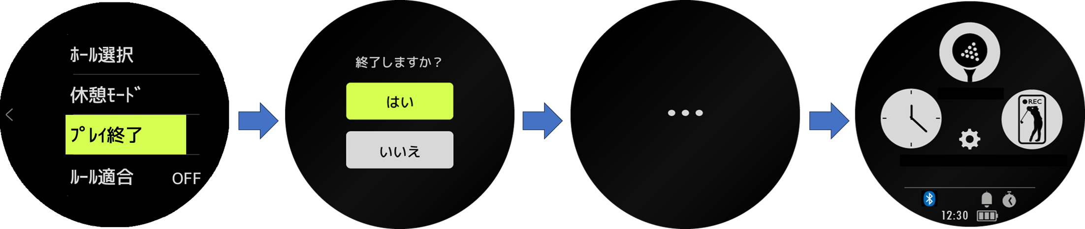 ホール検出後の「スタート」タップまたはOKキー押しでのラウンド開始までは 左スワイプまたはメニュー(パワー)キー短押しでメインメニューに戻ります。