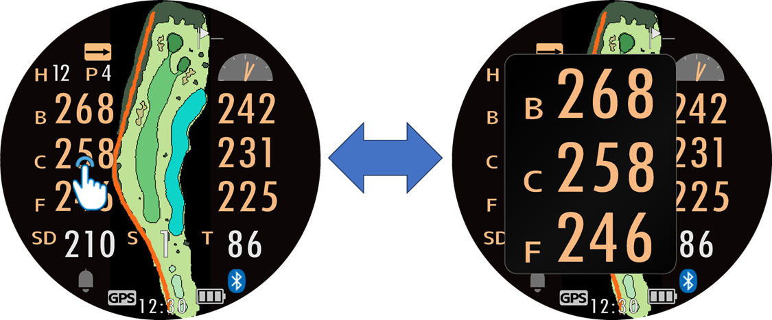 距離表示をタップすると拡大表示します。(2グリーンの場合はそれぞれ独立に拡大します) 拡大表示をタップすると標準サイズ表示に戻ります。