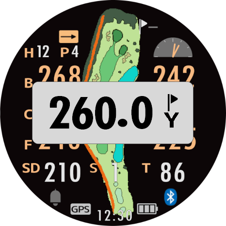 サマリー画面で下スワイプするかOKキーを押すとレイアップ/推奨クラブ画面を表示します。
