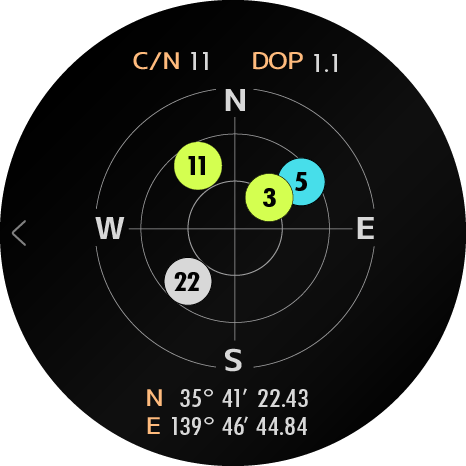 捕捉した衛星の数が多い(6以上)ほど精度の良い測定ができます。
