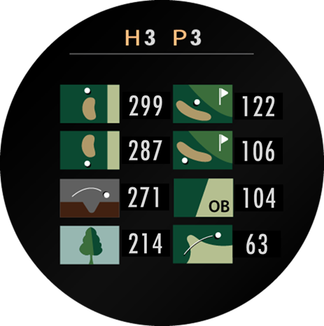 距離表示アイコンの下には現在ホールのホール番号とパー数を表示します。 ここをタップするとホール切替画面を表示し、ホールをマニュアルで切り替えることができます。 ホール切替画面から左スワイプまたはメニュー(パワー)キー短押しでサマリー画面に戻ります。