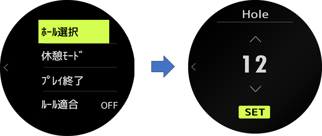切り替えたいホール番号が表示された状態でSETをタップするかOKキーを押すとホールが切り替わって元の画面に戻ります。
