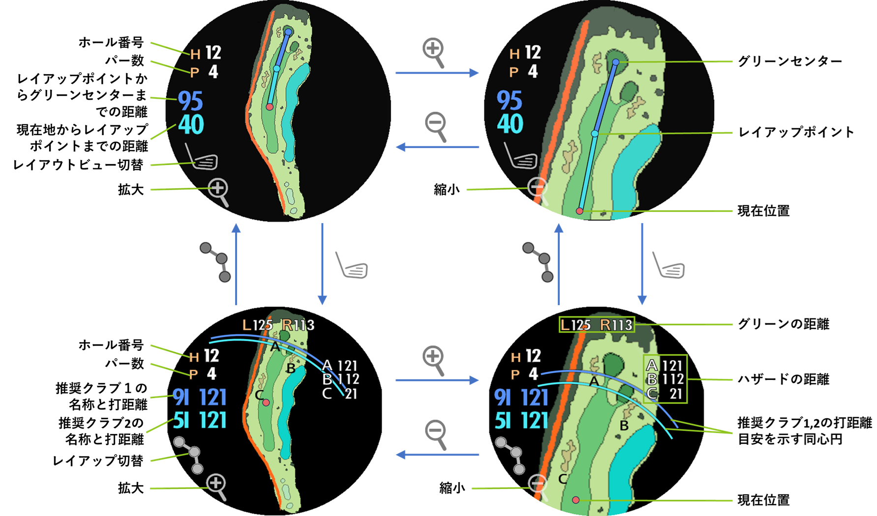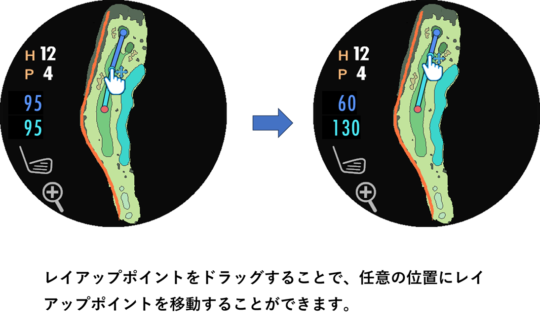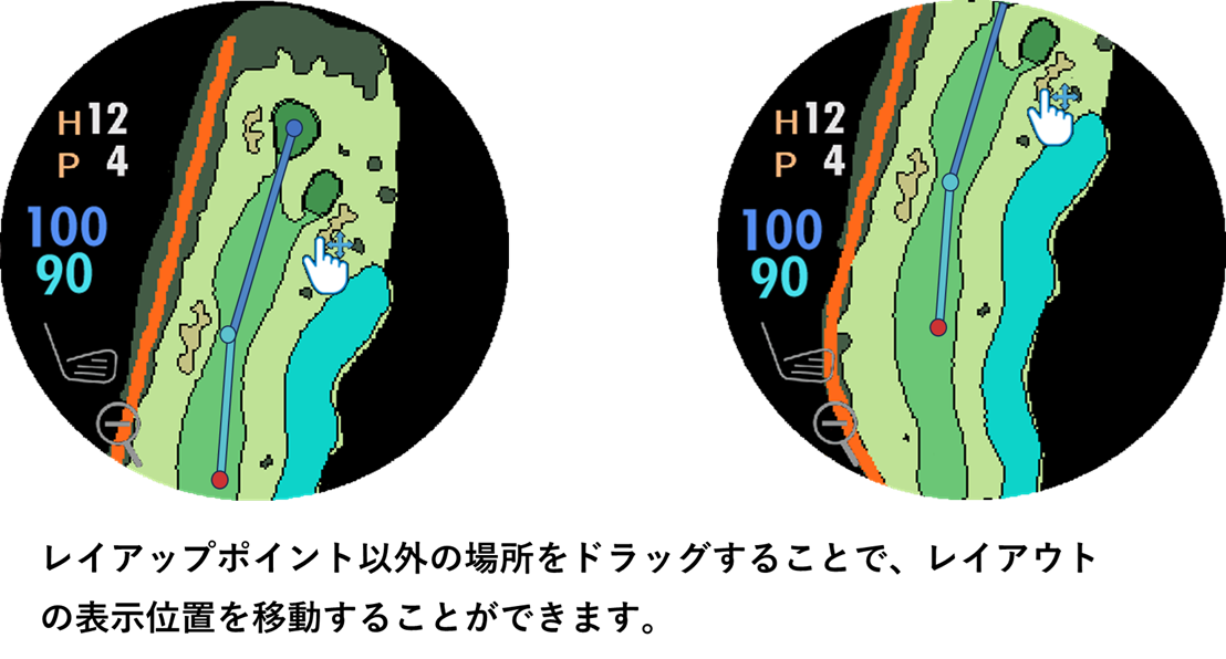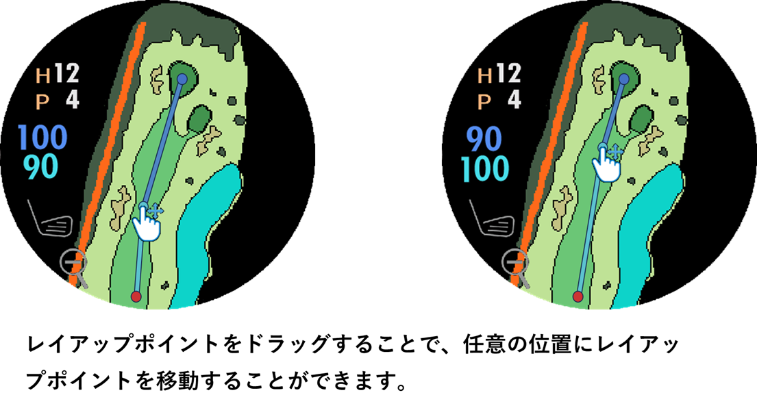 レイアップ画面では、コースレイアウトと、現在のホール番号、パー数、現在位置からのグリーンの方向、 現在位置から任意に動かせるレイアップポイントまでの距離、レイアップポイントからグリーンセンターまでの距離を表示します。