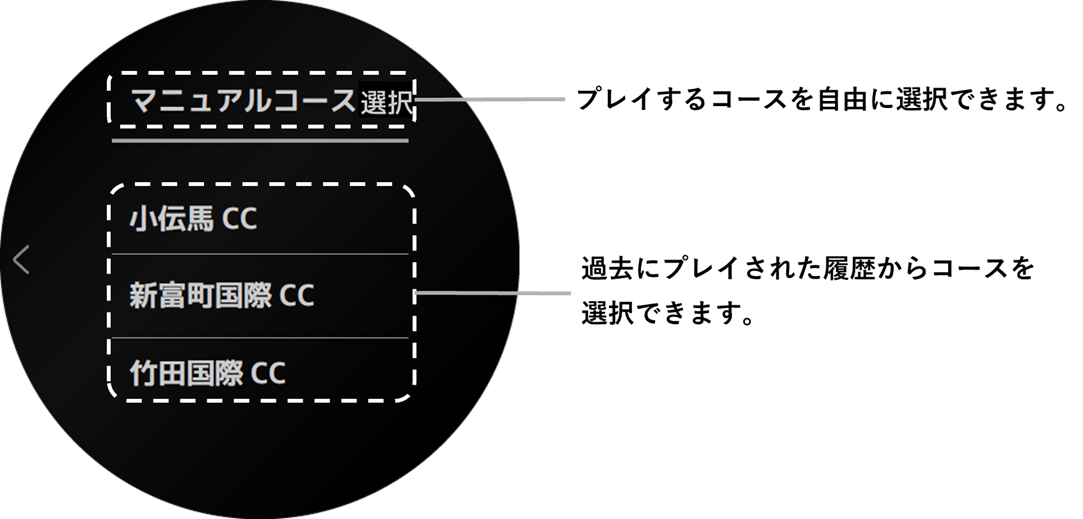 GPSステータス画面かコース検索画面の時に画面をタップするかOKキーを押してください。画面の指示に従ってプレイするコースを設定してください。