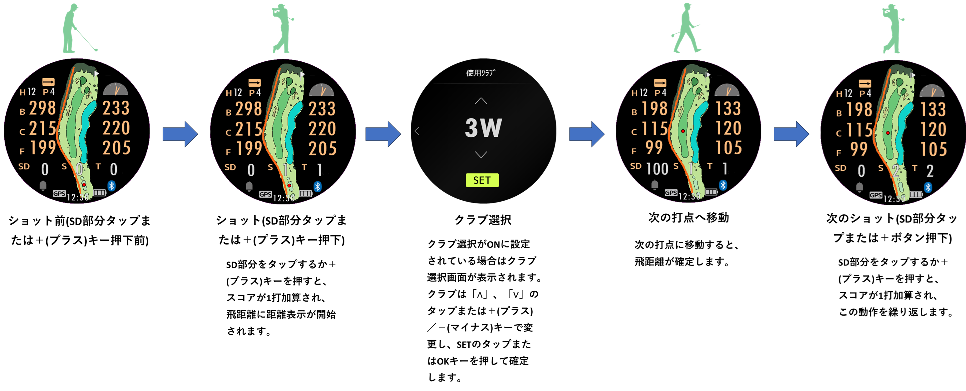 ショットの度にサマリー画面のSD(飛距離)部分をタップするか+(プラス)キーを押すとその地点が登録され、 1打加算されます。 次の打点へ行くと前のショットの飛距離が計測されます。