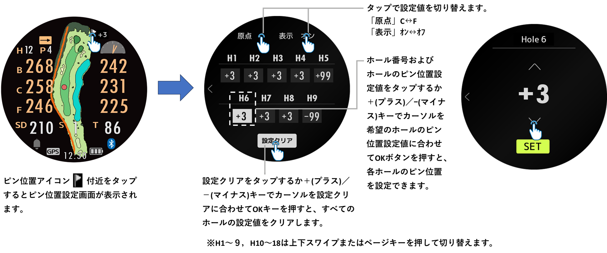 右上にはピン位置までの距離(ピン原点からの距離)を表示します。 ピン位置が入力されていてピン位置表示がオンの場合はC:センターの代わりに、 P:ピン位置までの距離を表示します。 この部分をタップすると、ピン位置入力画面を表示します。 ピン位置入力画面から左スワイプまたはメニュー(パワー)キー短押しでサマリー画面に戻ります。 ピン位置入力画面の上下スワイプまたはページキー短押しでホール1~9とホール10~18の入力画面が切り替わります。
