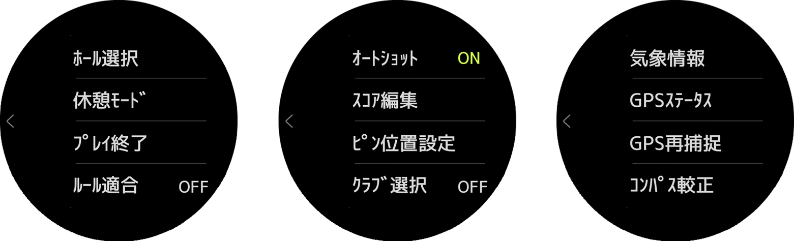 プレイ画面でメニュー(パワー)キーを短押しするとプレイメニューが表示されます。 ホール選択、休憩モード、プレイ終了、ルール適合、オートショット、スコア編集、ピン位置設定、 クラブ選択、気象情報、GPSステータス、GPS再捕捉、コンパス較正、省電力設定を選択できるメニューです。 上下スワイプによるスクロール、+(プラス)/-(マイナス)キー押しによるカーソル移動およびスクロールが行えます。
