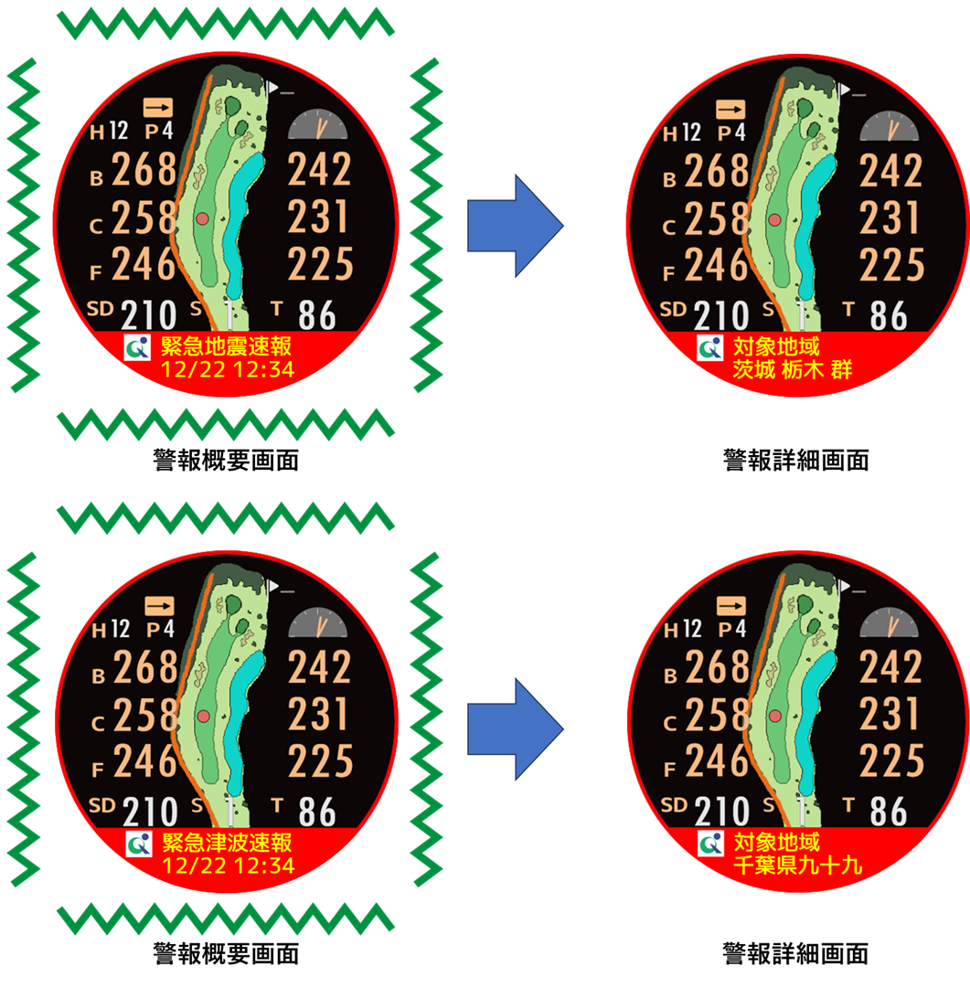 GPSキャディモードでプレイ中に、プレイしているゴルフ場を含む地域で気象庁が発表する「緊急地震速報」「津波速報」をみちびきから受信すると、 以下のように警報が表示され、バイブレーターが振動します。