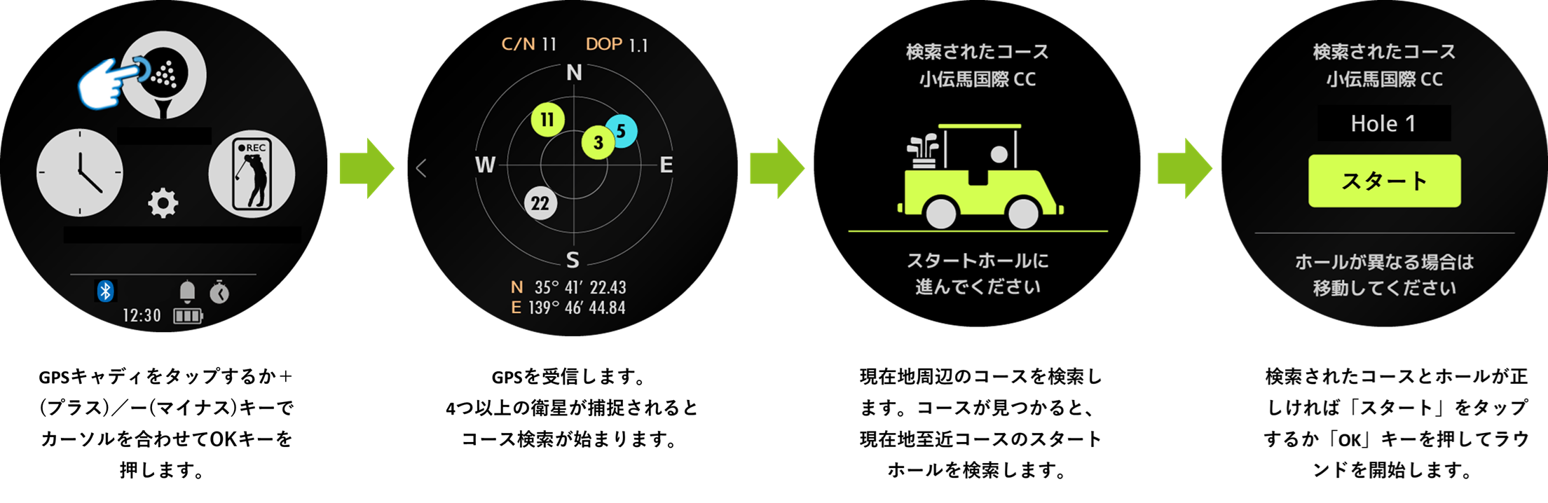 メインメニューの「GPSキャディ」をタップするか+(プラス)/ー(マイナス)キーでカーソルを合わせてOKキーを押すと、 GPSステータス画面を表示して受信を開始します。 位置情報が取得されると、コース検索画面になり、その位置のコースを検索します。 コースが検出されると、ホール検索画面になり、スタートホールを検索しますので、 スタートホールのティーグラウンドへ移動してください。 その後検出されたホールが正しければ「スタート」をタップするかOKキーを押すことでラウンド開始します。