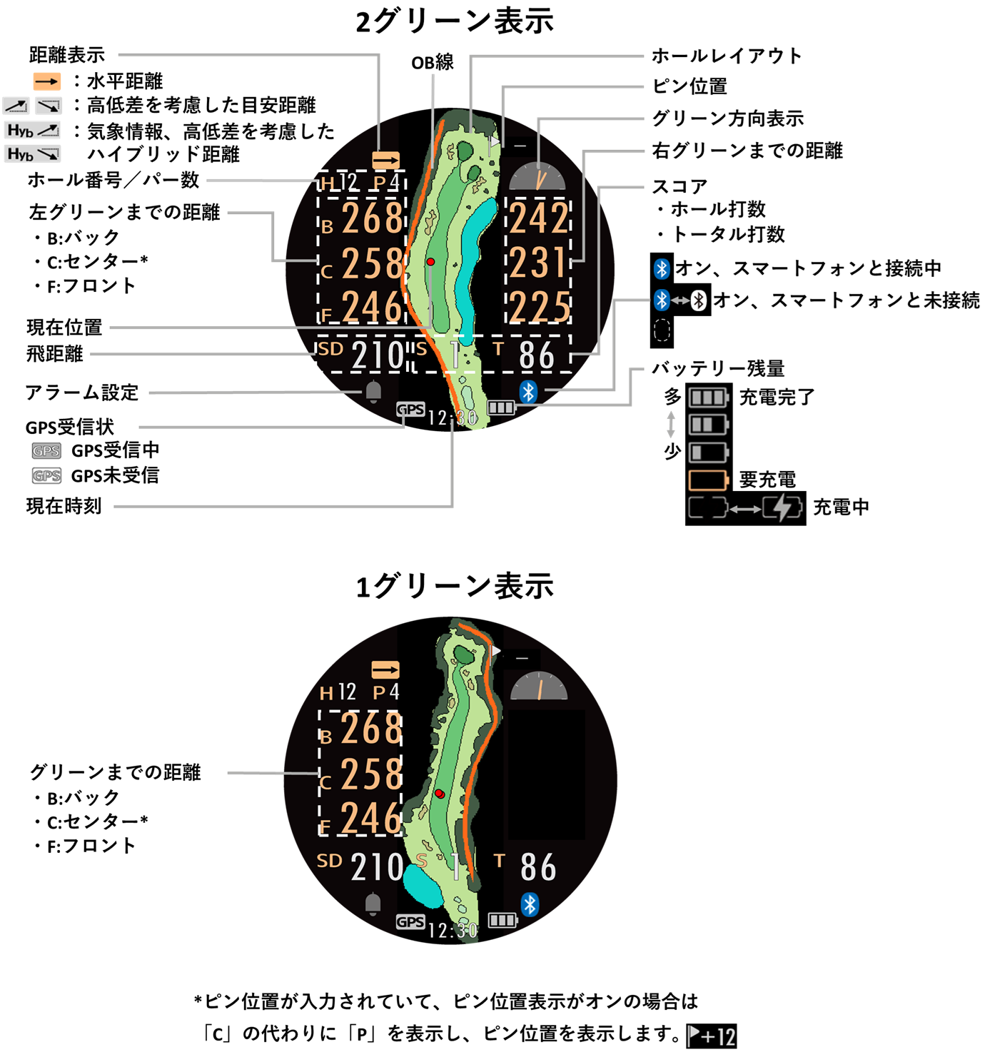 プレイ中に必要な情報が集約された画面です。 現在地からグリーンまでの距離(B:バック、C:センター、F:フロント)を表示します。 (2グリーンホールの場合は左右のグリーンまでの距離を同時に表示します)