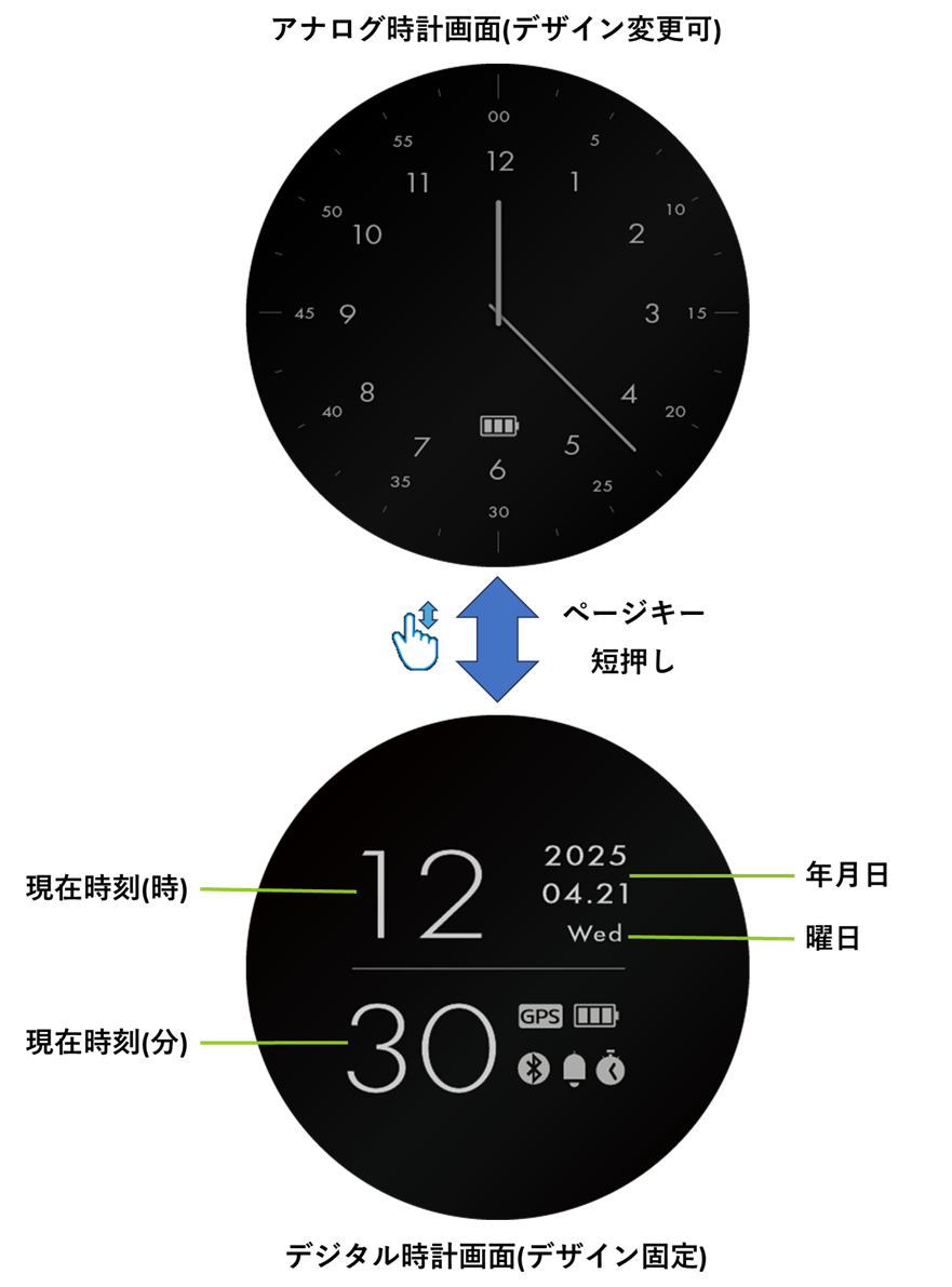 アナログ時計画面とデジタル時計画面の切り替えは、画面の上下スワイプまたは ページキーを短押しするたびに変わります。