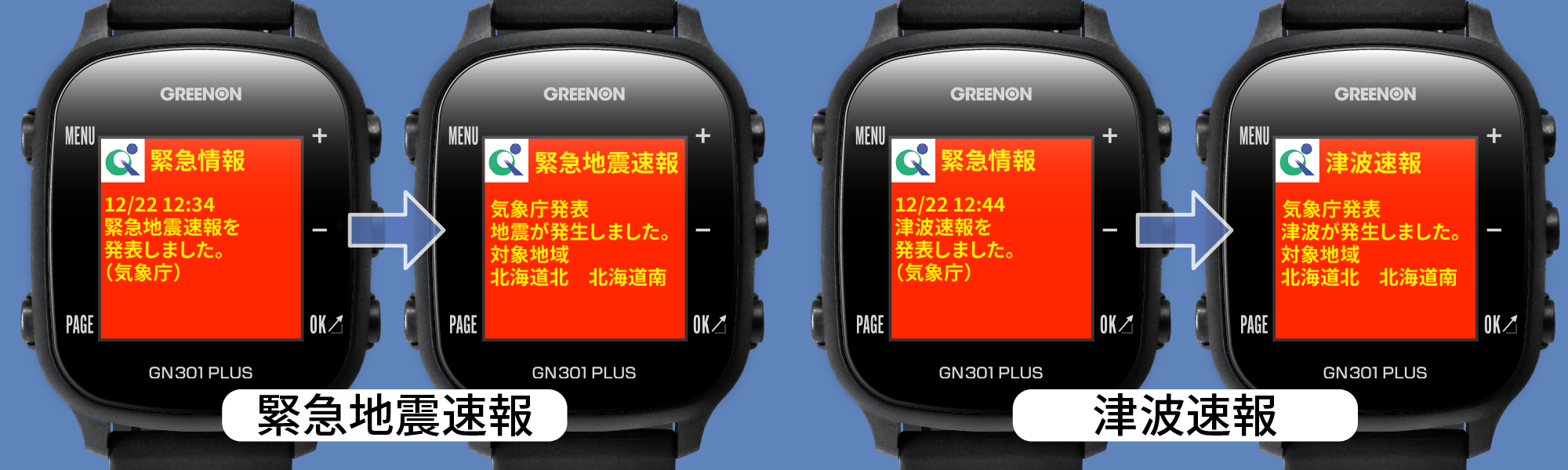 GPSキャディモード中にみちびき衛星から送信される緊急地震速報や津波速報を受信すると、みちびき災危通報を表示します。