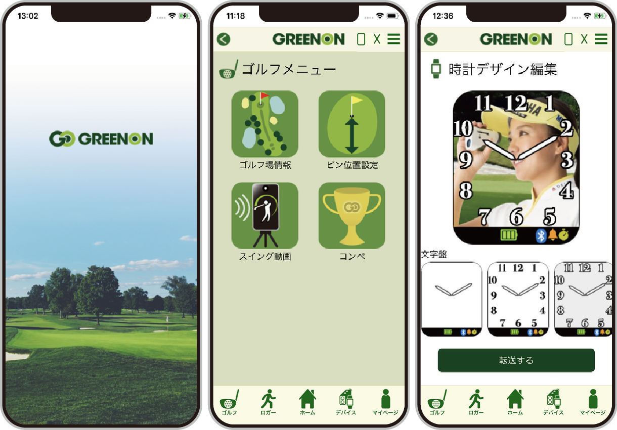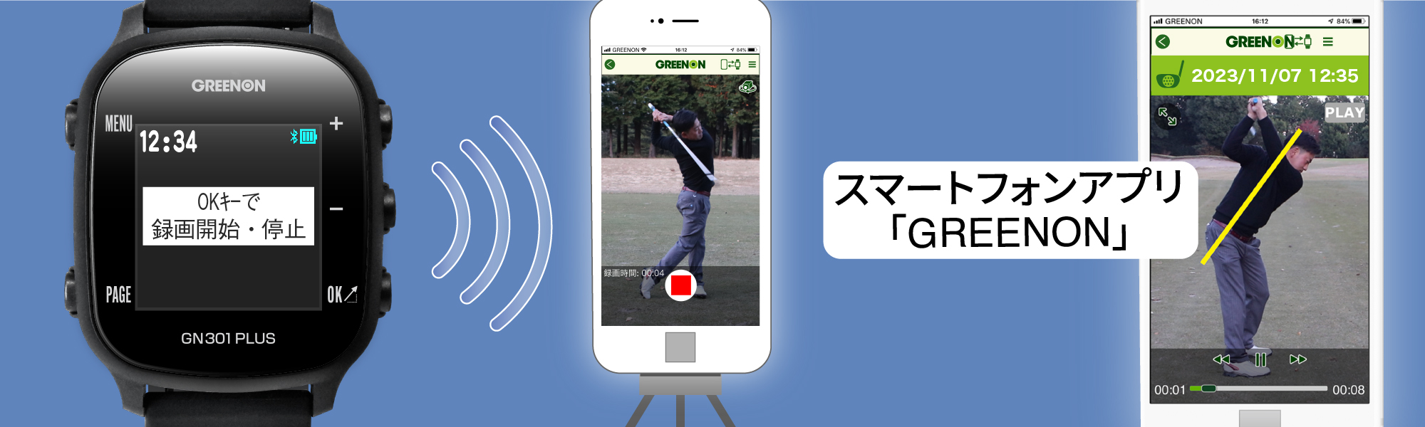 スマートフォンアプリ「GREENON」と連携し、簡単に自分のスイング動画の記録とスイングチェックができます。