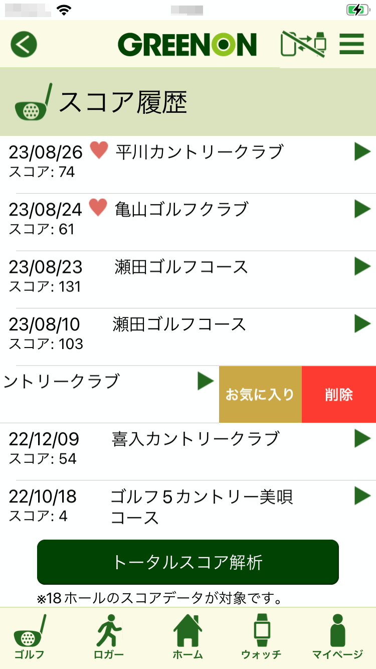 トータルスコア解析は 18ホール分のスコアが入っているラウンドのスコアのみ 解析します。 また、データがスマートフォン/タブレットに保存されていないラウンドのスコアは解析できません。