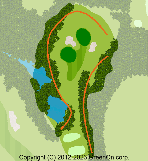 フェアウエイ左のバンカーの先にO.Bの池あり